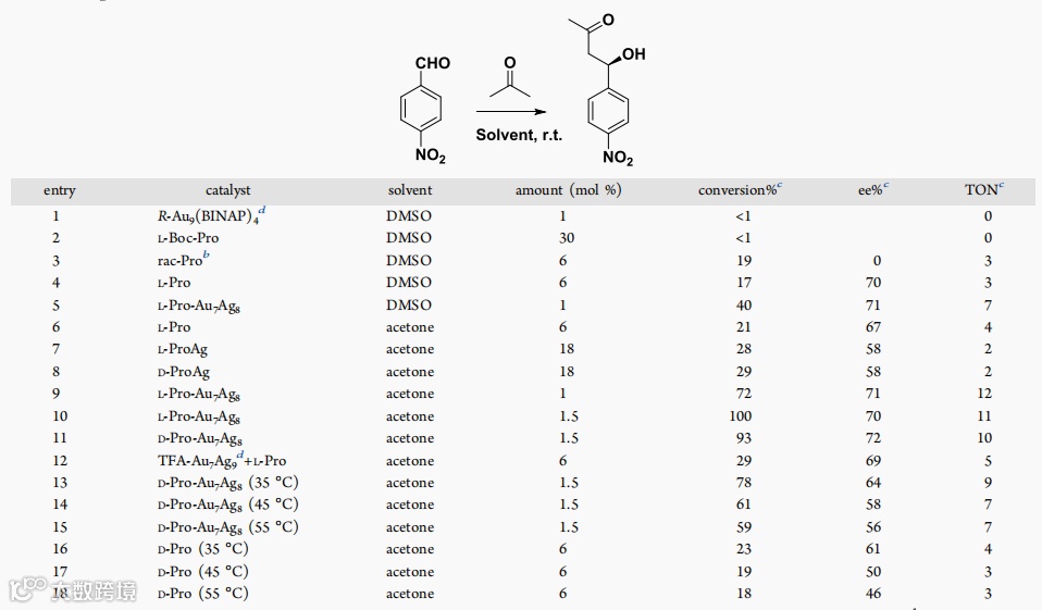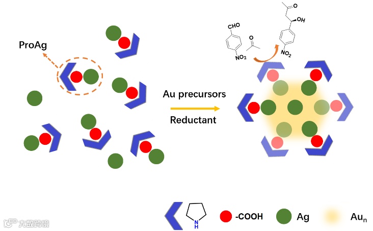 纳米团簇合成策略和表征技术的进步推动手性团簇性质的深入研究。不对称反应在构建具有药物活性的光学活性有机化合物方面具有强大的作用,然而,由于缺乏特定的催化位点,原子精确的纳米团簇对不对称反应的贡献尚未实现。目前,脯氨酸类生物分子在催化Aldol不对称缩合反应中应用广泛,然而,该类催化剂的低转化率(TON)限制其潜在应用。为了克服这一固有缺陷,在过去的几十年里,人们一直致力于发现和设计效率更高、TON更高的脯氨酸衍生物。