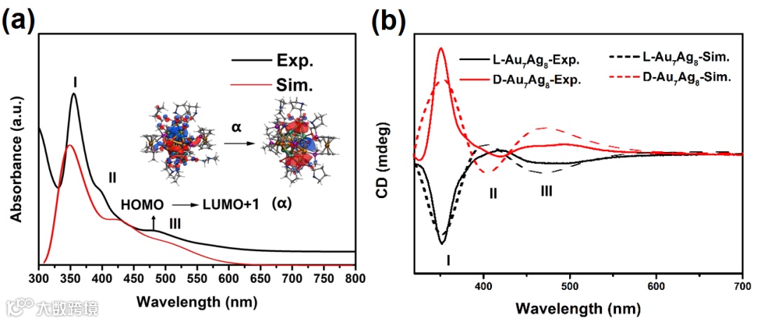 图2. L-/D-Au7Ag8的紫外吸收光谱、CD图谱以及其与理论模拟值的对比。