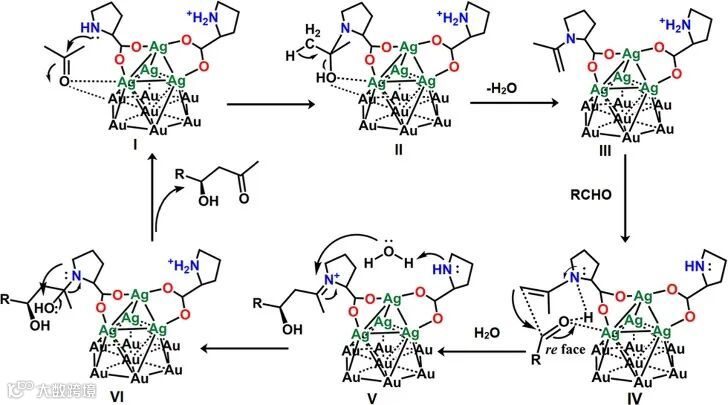 图3. Au7Ag8的催化Aldol反应的机理图解。