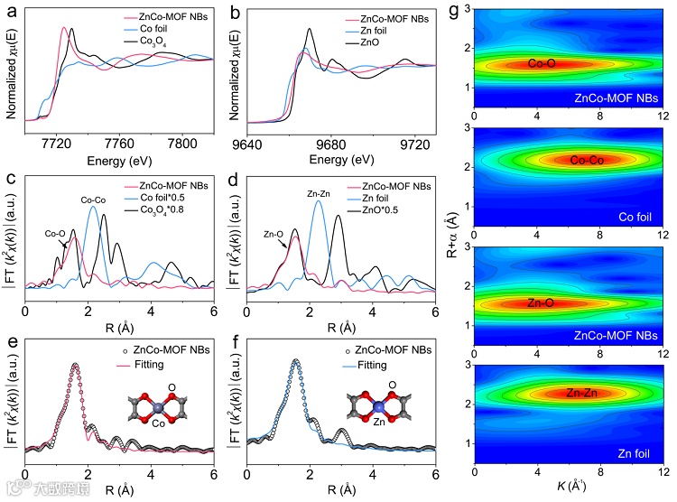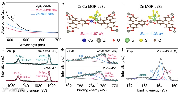 图5. (a) ZnCo-MOF和Zn-MOF计算的PDOS图;(b) ZnCo-MOF和Zn-MOF中Zn和Co的d带中心;(c) ZnCo-MOF-LiS的Co d、Co s和S p轨道的PDOS图;(d) Zn-MOF-LiS的Zn d、Zn s和S p轨道的PDOS图;(e) LiS吸附在ZnCo-MOF上的差分电荷密度图,黄色和青色区域分别代表电荷的积累和耗尽;(f) ZnCo-MOF和Zn-MOF上Li2S分解的能量曲线。