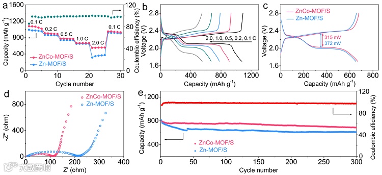 DFT计算结果表明ZnCo-MOF上Co位点的d态分布比Zn位点更接近费米能级 (Ef),表明Co的d轨道是主导活性轨道,决定了对多硫化物的吸附强度,进而决定ZnCo-MOF的催化活性。ZnCo-MOF上Co位点与LiS中间体的相互作用显著强于Zn位点,表明更高的催化活性。ZnCo-MOF上Li2S的分解能垒低于Zn-MOF,也意味着ZnCo-MOF可显著促进Li2S分解过程。