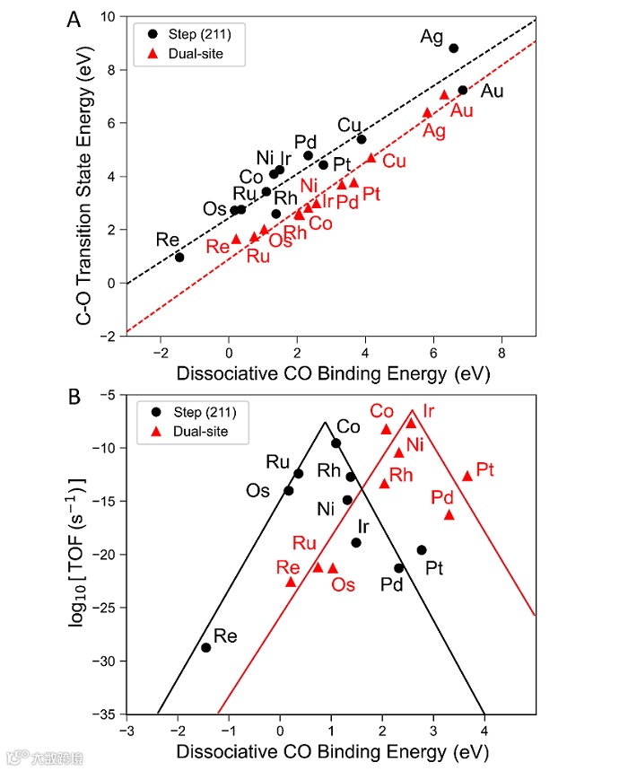 图2. 金属催化剂上CO解离能垒(A)和523 K / 3 bar反应条件下甲烷生成速率(B)与CO解离吸附能之间的关系