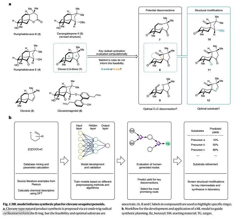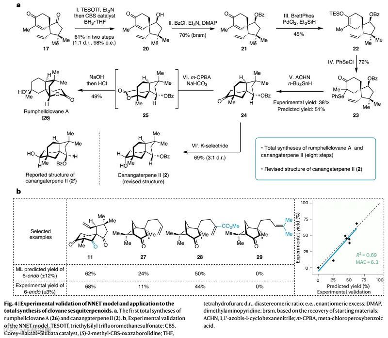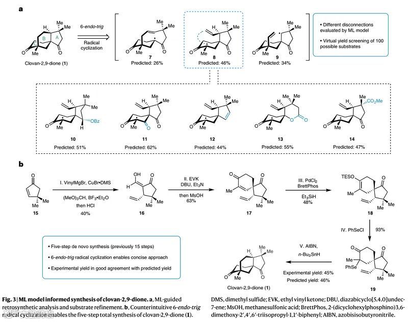自由基环化)的产率,指导合成路线设计和底物筛选,辅助实现了三个Clovane天然产物的高效全合成(5-8步),为机器学习模型指导复杂小分子的合成提供了范例