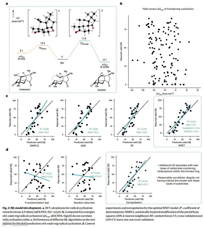 按照图1b所示的流程图,作者以Reaxys数据库中收录的自由基反应为研究样本,经分类和筛选、快速DFT计算(uB3LYP/6-31g(d))并提取相应物化参数(340个);随后经数据预处理(correlation及PCA)并用于模型的训练与验证。作者尝试训练了SIMPLS、kNN、RF等不同类型的模型,最终以神经网络模型(NNET)实现对6-