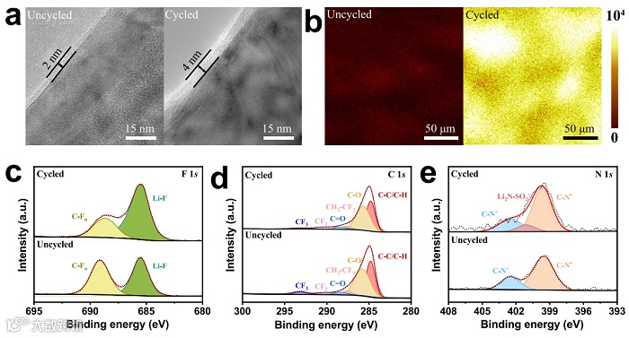 图3. (a) 循环前后正极表面TEM图像,(b) 循环前后正极表面LiF分布的TOF-SIMS图像对比,(c-e) 循环前后正极表面F 1s(c),C 1s(d),N 1s(e)的XPS图像。