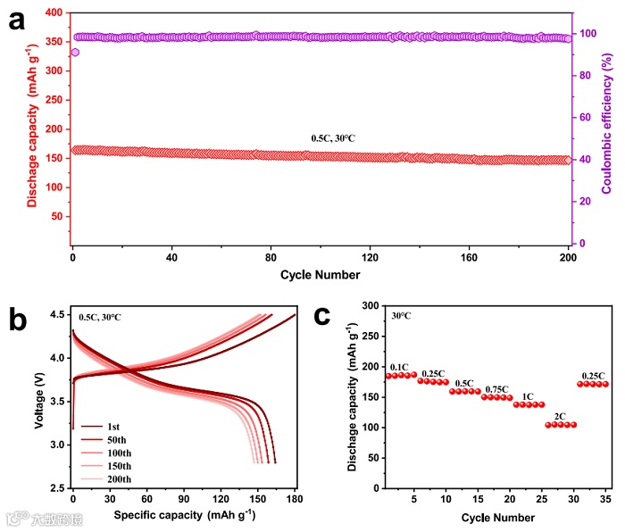 ,容量保持率接近90%。同时,该聚合物固态锂电池具有良好的倍率性能,在2 C的充放电速率下发挥出104.85 mAh