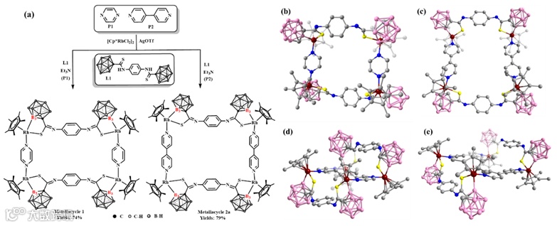 都发生了B(3)-H的金属化。由于B-H金属化产物往往是B-H官能团化的前驱体,作者设想能否进一步诱导该类型环状化合物发生B-H官能团化并再组装形成更加复杂的拓扑结构。