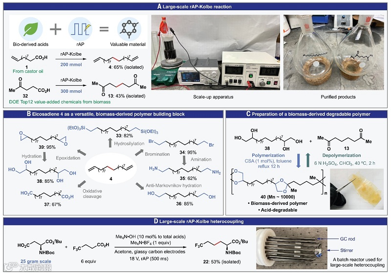 ),后者有可能应用于聚合物添加剂或商用聚合物的可降解替代物(图3B);3)从rAP-Kolbe反应衍生的单体(