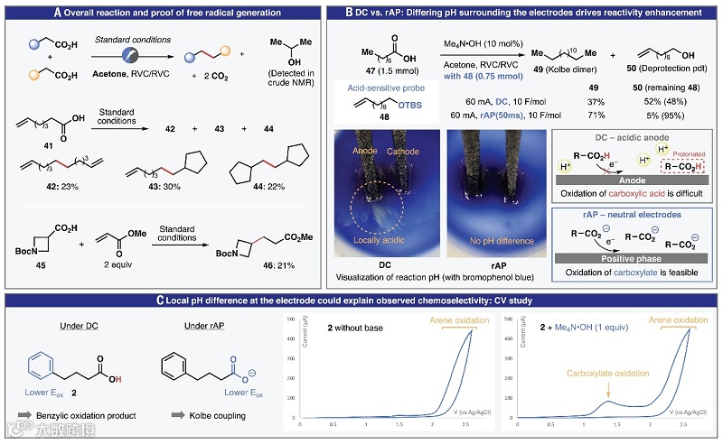 )分别在dc-和rAP-Kolbe反应中的实验结果表明rAP-Kolbe反应可以通过快速极性切换来避免电极钝化、其它官能团氧化与脱羧过程竞争(图4B)。由于快速震荡,在阳极就不会产生持久性酸性电极表面,进而使得脱羧氧化过程会优先发生;4)对反应进行pH检测后,发现dc-Kolbe反应中阳极周围的pH值较低;5)