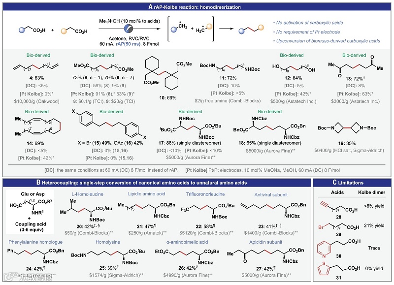 只需将电位波形从经典直流转换为快速交替极性,就可使Kolbe偶联反应兼容此前难以兼容的多种官能团,并且可使用廉价、可持续的碳基电极(无定形碳)