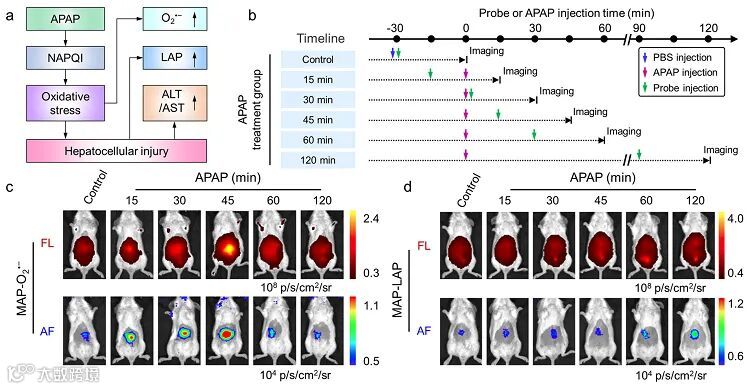 最后,为了验证MAPs在活体成像中的优越性,作者还将其应用于药物性肝损伤的高对比度余辉成像研究中。如图3所示,在余辉成像模式下,MAPs能够实时