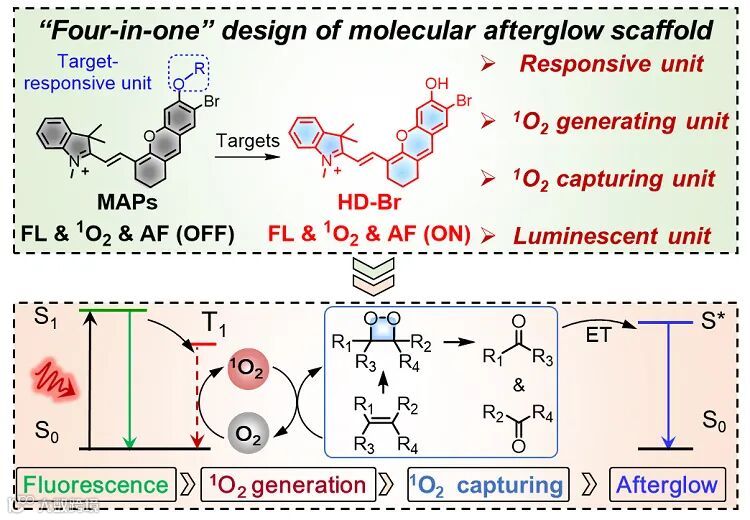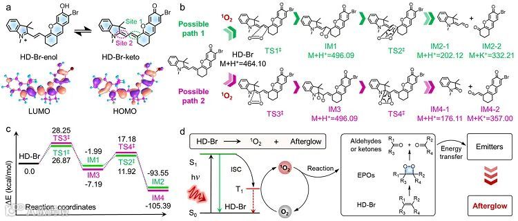 )产生能力之间的关系,筛选获得了余辉发光能力最强的候选分子HD-Br。并以HD-Br分子为研究对象,详细探讨了该类余辉发光分子的发光机理(如图2),简述如下:在激光照射下,HD-Br中的不稳定双键首先与产生的