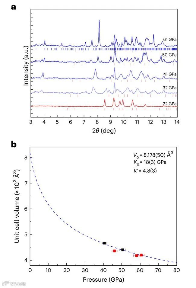 K9N56的PXRD谱图及晶胞体积随压力的变化。图片来源:Nat. Chem.