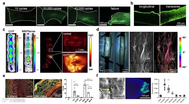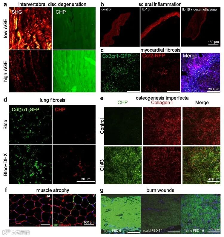 图4. CHP标记的疾病组织重塑产生的解旋胶原,包括在椎间盘炎症退变(a)、巩膜炎症(b)、心肌纤维化(c)、肺纤维化(d)、成骨不全症(e)、肌肉萎缩(f)、烫伤(g)等病变中发现的解旋胶原。图片来源:J. Am. Chem. Soc. 原文(扫描或长按二维码,识别后直达原文页面):The Chemistry and Biology of Collagen HybridizationXiaojing Li, Qi Zhang, S. Michael Yu*, and Yang Li*J. Am. Chem. Soc., 2023, DOI: 10.1021/jacs.3c00713 两位共同第一作者
