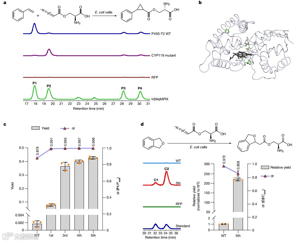 图4. 通过非生物卡宾转移反应生物合成非天然环丙烷。图片来源:Nature 总结