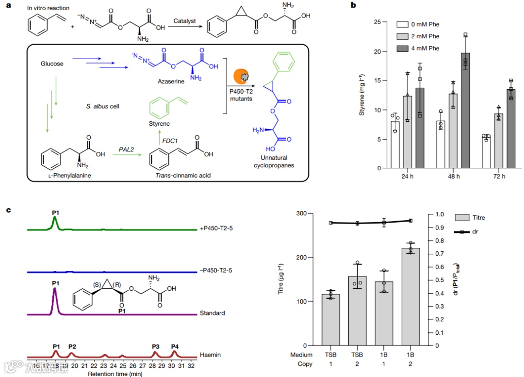 近日,美国劳伦斯伯克利国家实验室的Aindrila Mukhopadhyay和Jay D. Keasling以及加州大学伯克利分校的John F. Hartwig和Douglas S. Clark等研究者合作在Nature 上发表高水平文章,证明了天然α-重氮酯丝氨酸可以由生物合成基因簇改造的Streptomyces albus 菌株生成,并作为卡宾前体与细胞内产生的苯乙烯进行偶联反应以产生含有环丙基的非天然氨基酸。毫无疑问,这项研究为将这些卡宾转移反应完全整合到生物合成中奠定了基础,并拓宽了细胞代谢生产化学物质的范围和结构多样性。