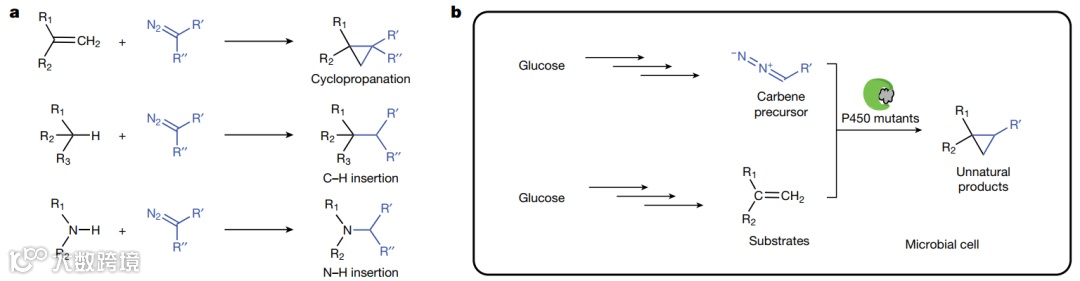 生物合成是一种环境友好且可再生的方法,可用于合成许多天然产物,并且在某些情况下还可以生成“新天然(new-to-nature)”产物。然而,与合成化学不同,生物合成领域并没有那么多可用的反应,能生产的产品范围要窄得多。其中一个重要的例子,就是卡宾转移反应。尽管此前研究已经提出了一些涉及卡宾中间体的天然酶促转化,但将其用于非天然生物合成却极具挑战性。近年来,金属酶被用于催化许多非生物卡宾转移反应(图1a),例如:烯烃的环丙烷化、卡宾单元插入N-H和C-H键,并且这些酶表现出优良的非天然活性和选择性。然而,作为卡宾前体的重氮化合物和金属辅助因子需要从外部添加到细胞中,这极大地阻碍了高性价比的工艺放大。可以想见,在细胞内合成卡宾前体以及工程化酶催化剂将会解决这些问题,并大大扩展酶促非天然卡宾转移反应的应用(图1b)。