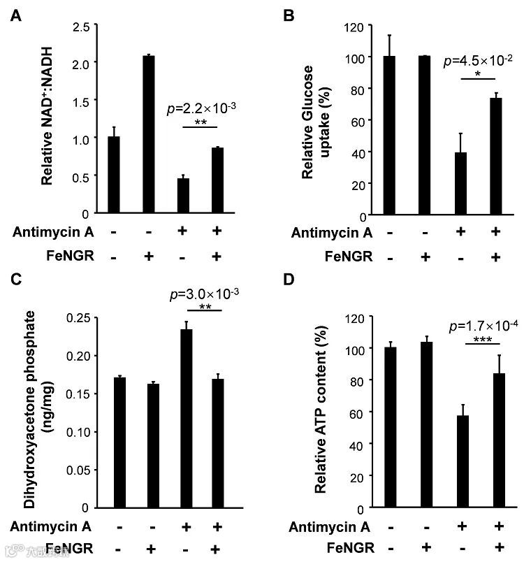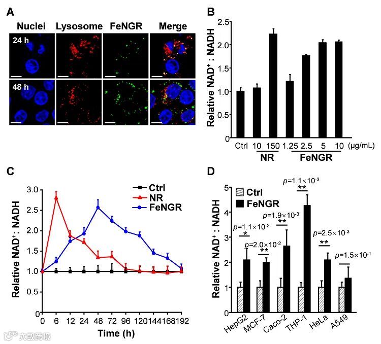 图3. FeNGR在代谢异常小鼠体内的作用。(A)SPECT-CT检测小鼠体内125I-FeNGR的分布;(B)肝脏切片中FITC-FeNGR分布的共聚焦图像;(C)FeNGR对小鼠肝脏中NAD+/NADH比率的影响;(D)FeNGR对小鼠血液中甘油三酯水平的影响;(E)小鼠血清代谢产物的主成分分析。