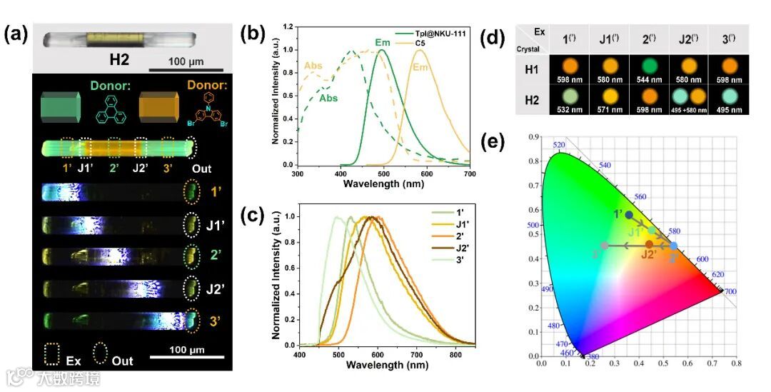 图2. (a) 异质结构晶体H2以及通过激发H2晶体不同位置获得的光致发光图像;(b)Tpl@NKU-111的吸收光谱(绿色虚线)和发射光谱(绿色实线)以及C5的吸收光谱(黄色虚线)和发射光谱(黄色实线);(c)基于H2不同激发位置的空间分辨发射光谱;(d) 通过在H1和H2上改变激发位置实现的端口发射信号波长的总结;(e) 基于H2不同激发位置的空间分辨发射光谱对应的CIE坐标