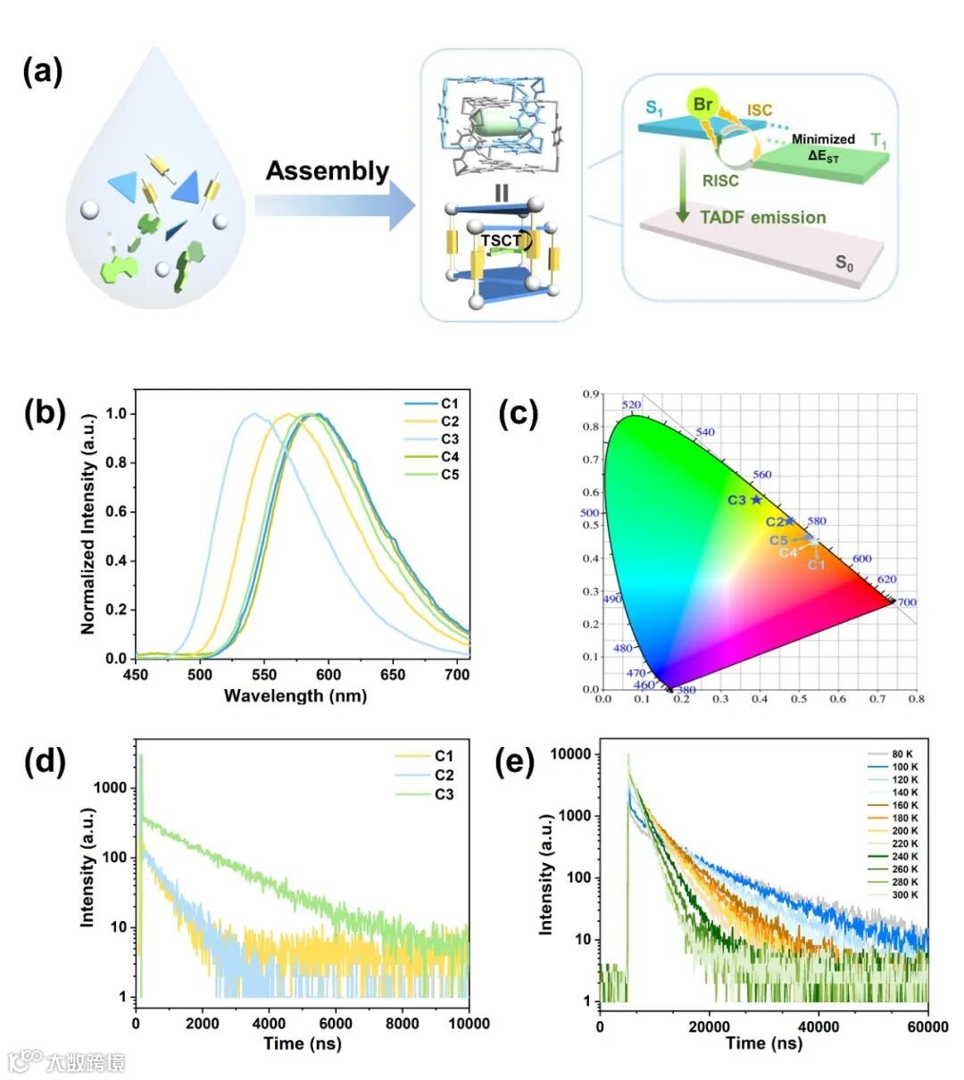 图1. (a) D-A MOFs的构筑以及溴作为重原子优化TADF机制示意图;(b) 系列D-A MOFs发射光谱图;(c) 系列D-A MOFs的CIE坐标;(d) C1-C3的室温瞬态衰减曲线;(e) C3在543 nm处的变温衰减曲线