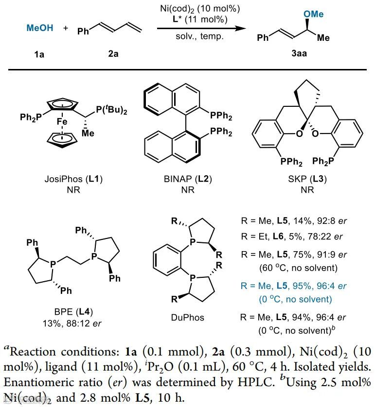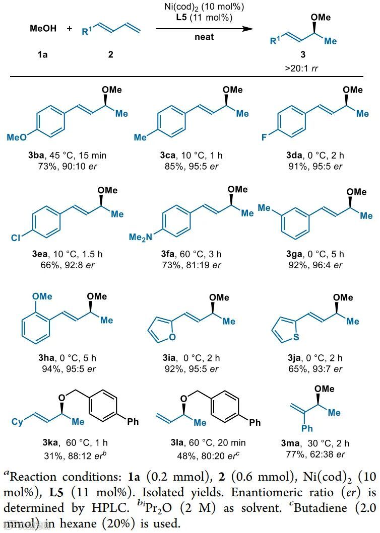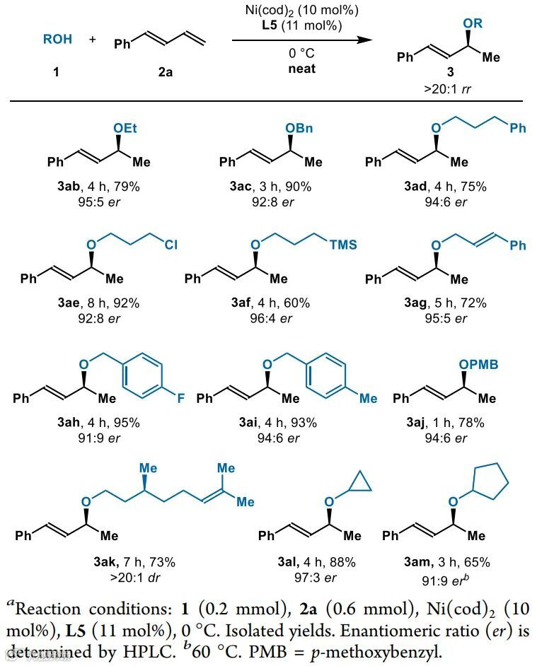 作者首先以甲醇(1a)和1-苯基-1,3-丁二烯(2a)为模型底物,对配体和反应条件进行优化(表1)。研究发现,以Ni(cod)2为催化剂,以L5为配体,反应能以14%的收率、92:8 er的对映选择性和>20:1 rr的区域选择性得到目标产物烯丙基醚。然而,类似于Mazet课题组和Sauthier课题组的报道,作者也发现对映选择性会随着反应时间的延长而急剧下降,但意外的是,这种对映选择性的降低可以通过使用无溶剂条件克服。在无溶剂条件下,反应能以75%的收率、91:9 er的对映选择性和>20:1 rr的区域选择性得到醚3aa。当温度降低到0 ℃时,反应4 h对映体选择性提高到96:4 er,产率为95%。