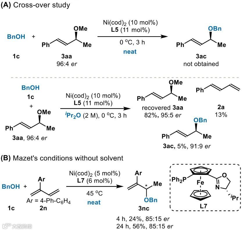 通过交叉实验研究(图4A),并结合Sauthier课题组和Macgregor课题组报道的丁二烯氢烷氧化反应研究结果,作者推测无溶剂条件可以在较低的温度(0 °C)下进行,从而通过动力学控制的过程避免了消旋化的发生。无溶剂条件抑制C-O键形成的逆过程,这一现象可能有广泛的应用。作为一个应用例子,作者研究了Mazet课题组报道的将支化1,3-二烯2n转化为3nc的反应条件;在没有溶剂的情况下,作者发现以前选择均三甲苯作为溶剂时的消旋化现象并没有发生(图4B)。