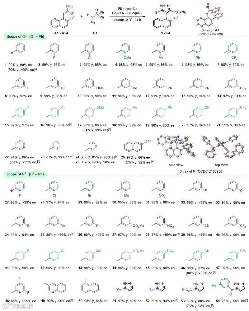 以多功能手性季鏻盐作为催化剂,首次利用不对称Huisgen环化/芳构化的串联反应实现了一系列轴手性芳基-吡唑膦化合物的高效不对称合成