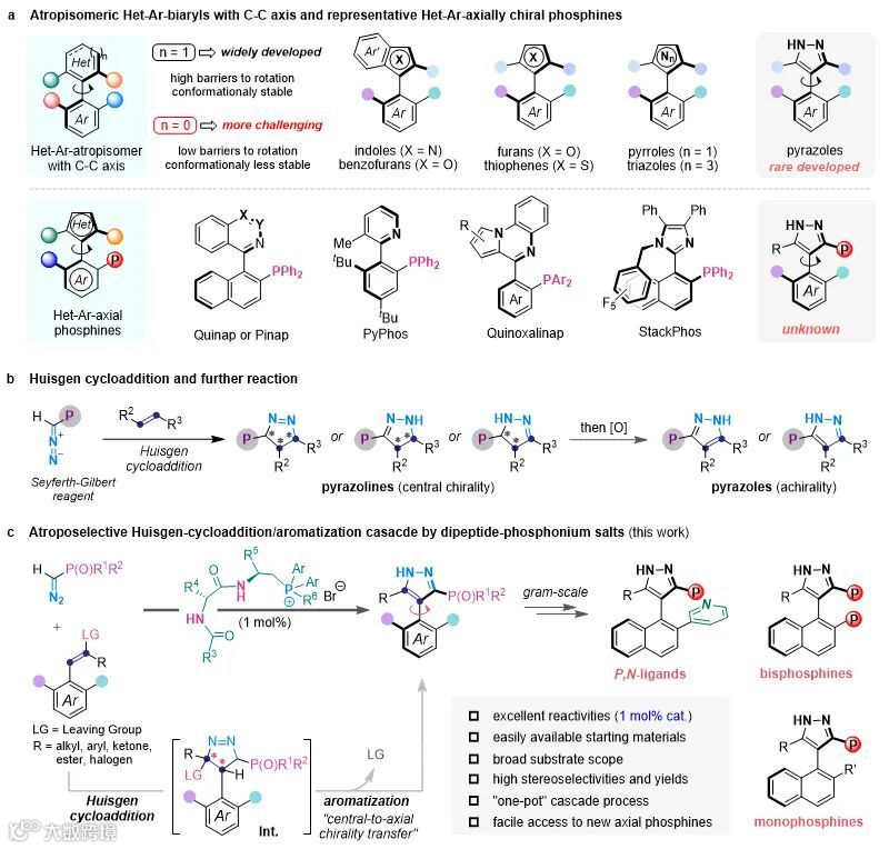 导读:四川大学王天利课题组以多功能手性季鏻盐作为催化剂,首次利用不对称Huisgen环化/芳构化的串联反应实现了一系列轴手性芳基-吡唑膦化合物的高效不对称合成