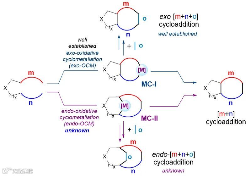 )。随后,这些环加成反应会发生还原消除生成[m+n]产物,或插入另一组分o后再发生还原消除而生成[m+n+o]产物。这种机制中的氧化环金属化可称为外型-氧化环金属化(