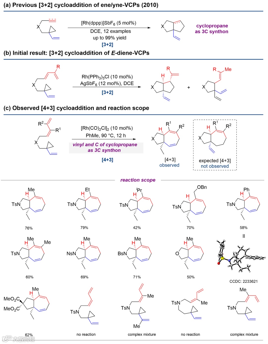 导读:余志祥课题组在Chem 上报道了他们发展了一类铑催化的分子内顺式双烯-乙烯基环丙烷的[4+3]反应