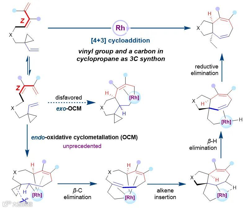 上报道了他们发展了一类铑催化的分子内顺式双烯-乙烯基环丙烷的[4+3]反应(图4)。其中,双烯作为四碳组分参与反应,而乙烯基和环丙烷的一个碳原子共同扮演了三碳组分的角色。其次,作者在研究反应机理时发现了一种文献未曾报道的内型-氧化环金属化(