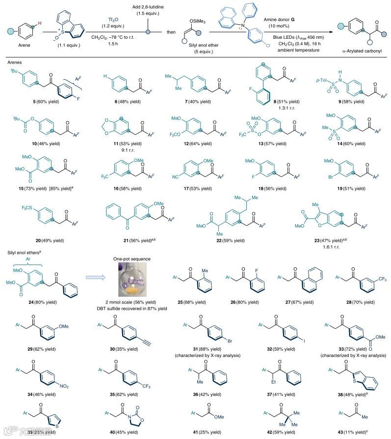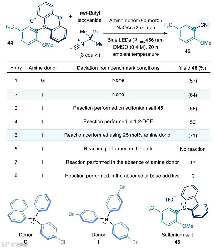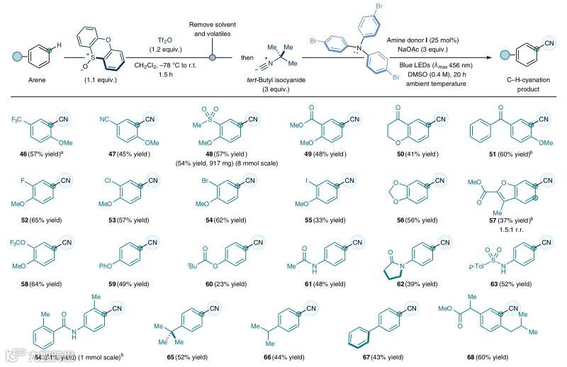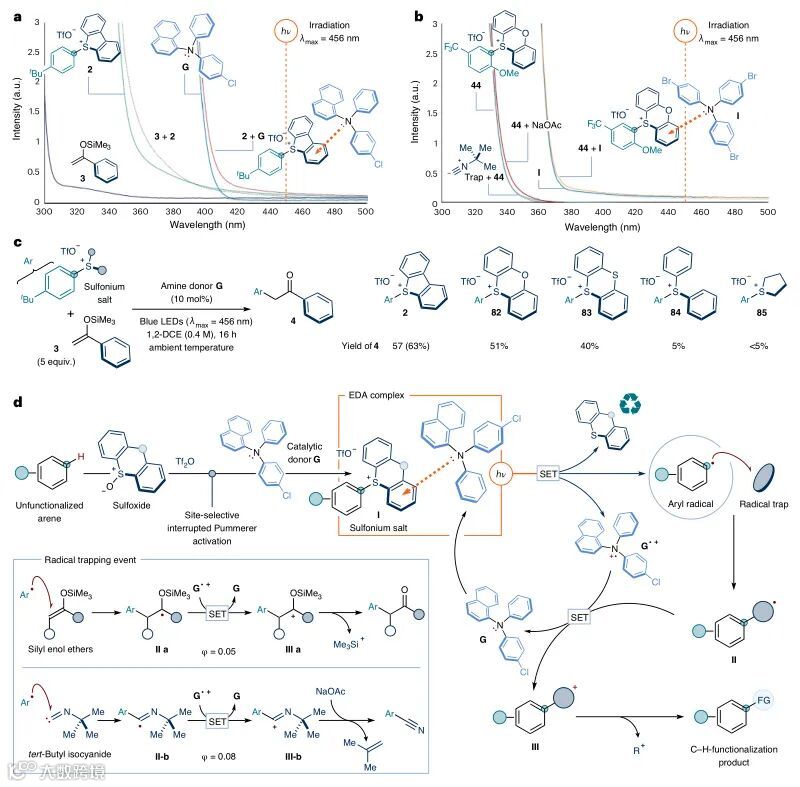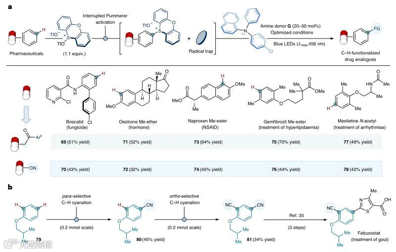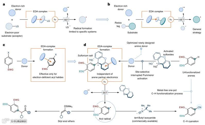 David J. Procter教授利用原位生成硫鎓盐作为电子受体与新设计的三芳基胺供体形成了蓝光吸收的EDA复合物,并且在光活化下促进了芳基自由基的形成。随后在无金属催化作用下,利用此过程成功地实现了芳烃的位点选择性C-H键烷基化和氰化反应,并且在药物分子和农用化学品的合成和后期修饰中也有不错的应用潜力。