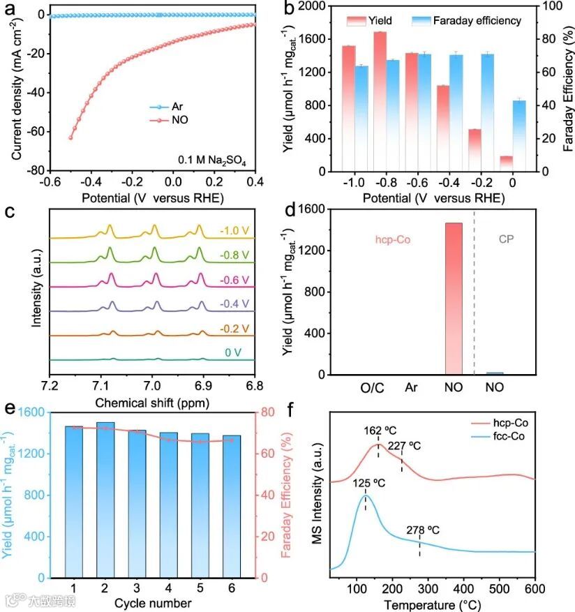 图2描述了hcp-Co电催化剂的NORR性能。在-0.6 V vs. RHE的电位下,N