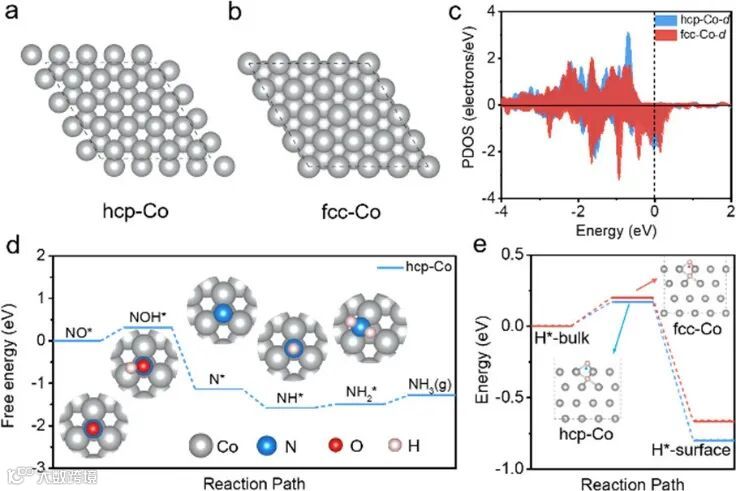 图3. DFT计算。(a) 优化的hcp-Co原子结构;(b) 优化的fcc-Co原子结构;(c) hcp-Co和fcc-Co中d轨道的PDOS;(d) NORR在hcp-Co上的反应过程及反应自由能和所有反应中间体的优化结构;(e) 质子从hcp-Co和fcc-Co本体向表面的扩散过程。