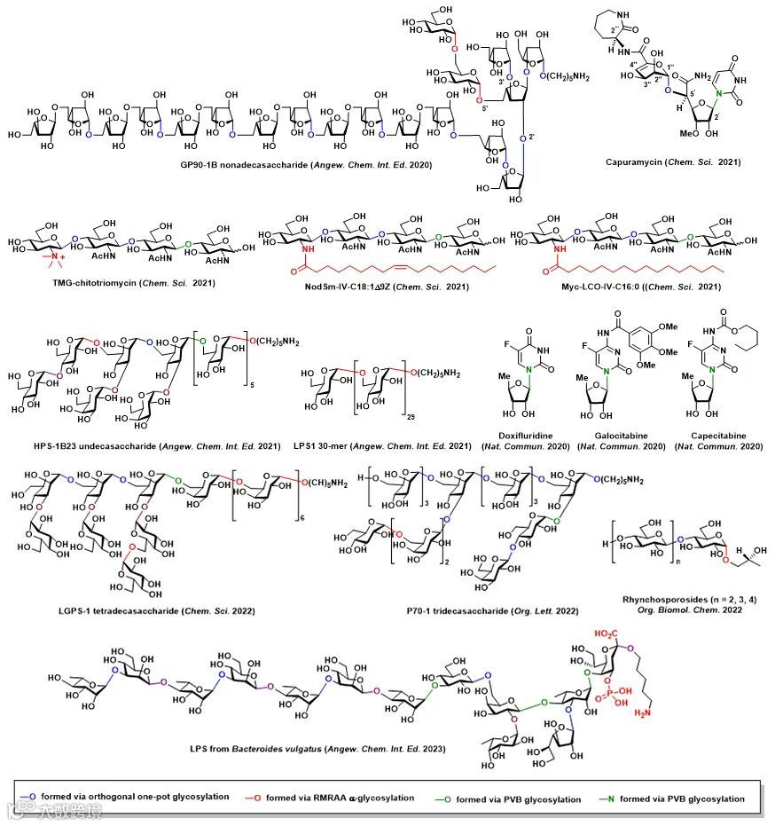 , 5143)(图2)。该糖组装新策略不仅解决了之前基于硫苷的正交一锅法合成所存在的硫苷苷元转移,离去基团干扰和硫醇味道大的问题,同时增加了多步一锅糖苷化反应糖基给体的数目。采用基于糖基PVB的正交性和反应活性一锅高达构建四根不同的糖苷键。另外,作者首先报道了采用基于糖基PVB一锅糖苷化反应高效合成各种不同的核苷,为氧苷和核苷高效合成开辟了新的道路。