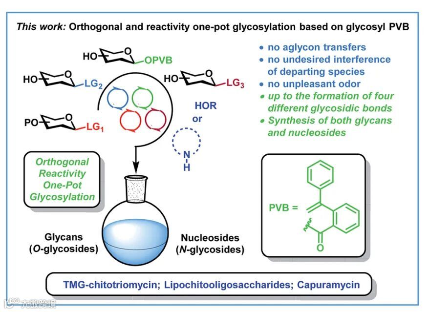 正交一锅糖苷化反应策略是最受欢迎的一锅糖苷化反应策略之一。其中,基于硫苷的正交一锅糖苷化反应策略已经成功地应用于许多寡糖和糖缀物的全合成中。但是,该策略存在一些问题:苷元转移、离去基团干扰和硫醇难闻气味。同时,可以进行正交一锅糖苷化反应的糖基给体的数目依然有限。另外,适用于核苷一锅法合成的策略在作者开展工作之前尚未报道。为了解决这些问题,2021年,肖国志课题组首次发展了同时适用于氧苷和核苷基于糖基PVB给体的一锅糖苷化反应糖组装新策略(