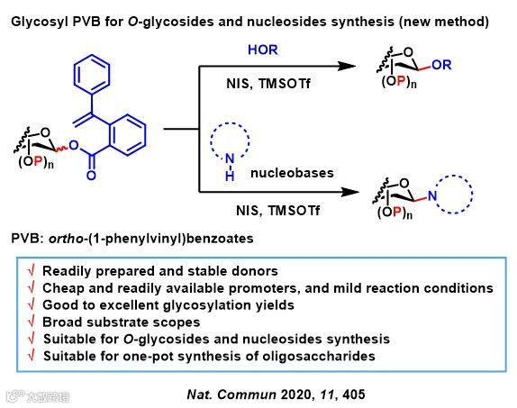 , 405)。此方法采用易于制备而且稳定的糖基邻1-苯基烯基苯甲酸酯(PVB)为新颖的糖基给体,