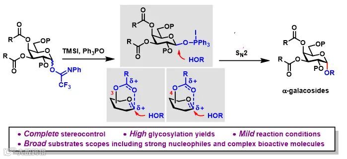 2022年,肖国志课题组进一步将融合试剂调控和酰基远程参与的立体选择性糖苷化反应新策略扩展到1,2-顺式半乳糖糖苷化反应,实现了1,2-顺式半乳糖糖苷键的高立体选择性构建(α/β > 20:1)(