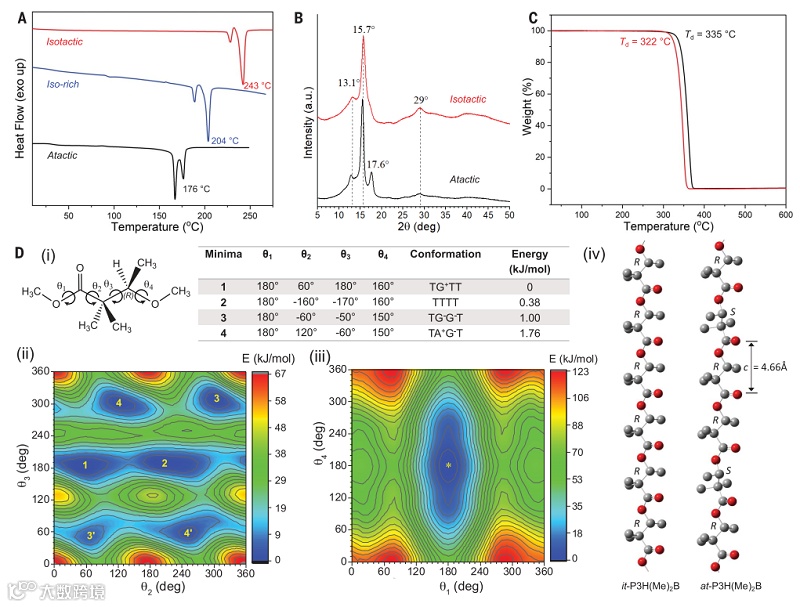 175 °C)。无规立构双甲基聚(3-羟基丁酸酯)同样具有较高的熔点(167/176 °C),从而表明该类双甲基取代的聚合物具有固有的不受立构规整度影响的结晶度。进一步的差示扫描量热法和变温广角X射线散射表明,双甲基聚(3-羟基丁酸酯)两个熔融峰的出现是由于同一种晶型的熔融和再结晶引起的而不是来源于两种晶型。具体来说就是,低规整度的晶区先在167-169 °C范围内熔融然后迅速结晶成高规整度的晶区,之后在更高的温度范围内(177-181 °C)被再次熔融。由于双取代基的引入,双甲基聚(3-羟基丁酸酯)表现出出色的热解温度(~330 °C),从而为其热加工提供了条件。为了理解此类高分子展现出的不受立构规整度影响的结晶度的现象,作者开展了一系列针对高分子链构型及构象能的计算模拟。结合此高分子制成的定向纤维的二维X射线衍射结果,作者发现无规立构双甲基聚(3-羟基丁酸酯)的链构型和其等规聚合物非常相似,从而解释了这类高分子具有的不受规整度影响的相似结晶度现象。