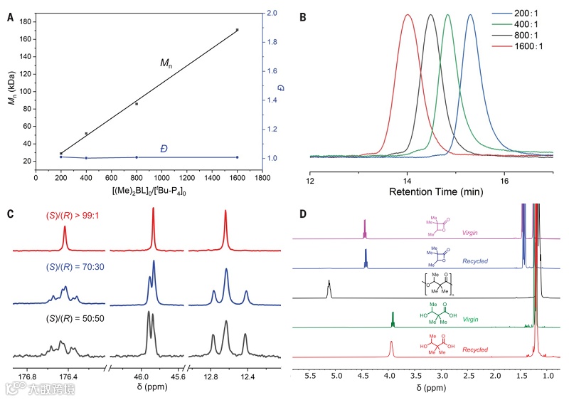聚合行为的研究表明,分子量随着单体/催化剂比率的增加而线性增加,而且由此产生的聚合物的分散度仍然非常窄,表明聚合过程具有很好的可控性。该聚合可以在实验室很容易放大到百克以上,同时只需ppm级别的催化剂量,而且反应是本体聚合不需要外加溶剂,同时可达到96%的单体转化率。为了研究不同等规度高分子的立体微观结构及热性能,作者合成了手性单体从而聚合得到纯等规聚合物,另外,不同比例的R和S型单体混合共聚可以得到不同比例的等规度。由于α,α-二烷基取代带来的Thorpe-Ingold效应,即促进闭环和稳定张力环,该类二烷基取代的PHA可以被高效回收,得到四元环内酯单体。此外,这种新型PHA也可以通过水解的方式定量得到羟基酸单体,然后一步环化得到四元环内酯,或者先通过聚合得到寡聚物,之后再解聚得到四元环内酯。因此,该二甲基取代策略实现了PHA的两种途径的高效化学回收。
