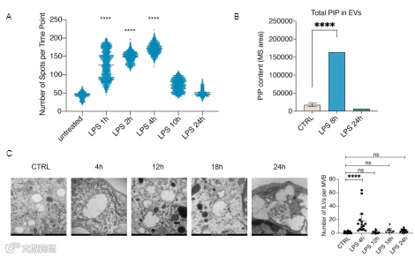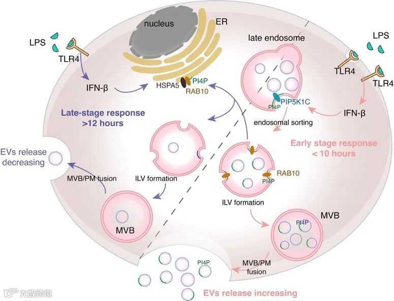 研究发现在TLR4激活条件下,巨噬细胞内EVs释放速率随TLR4的配体革兰氏阴性细菌外部细胞壁的一种主要糖脂组分——脂多糖(Lipopolysaccharide,LPS)刺激时间先升高后降低,表现出明显的时间规律。通过与瑕瑜课题组合作,对EVs中微量磷脂PIP的定量检测,发现介导囊泡生成的PI4P与EVs的释放速率呈显著正相关关系,并进一步阐释PIP在EV生成与释放中的分子机制(图1)。