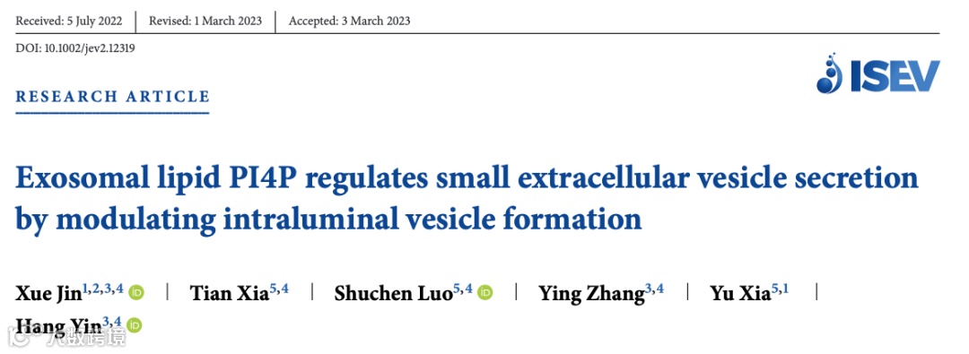 题为“Exosomal lipid PI4P regulates small extracellular vesicle secretion by modulating intraluminal vesicle formation”的文章(DOI: 10.1002/jev2.12319),与瑕瑜教授合作,报道了磷脂酰肌醇(Phosphoinositolphosphates,PIP)在EVs中的含量及在天然免疫激活条件下的变化情况,并阐明了PIP在EV生成中分子机制。