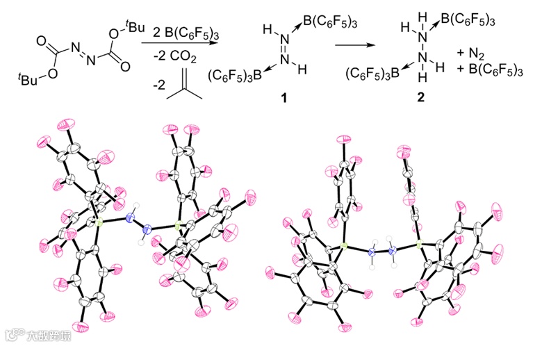 作者从含有Boc保护基的偶氮化合物出发,在路易斯酸作用下脱去Boc保护基,同时生成的双氮物种原位加氢,并被路易斯酸配位稳定,从而分离并完整表征了首例路易斯酸-二氮烯配合物