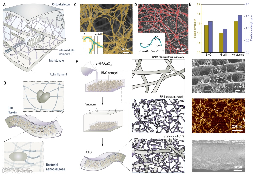 近日,上海科技大学凌盛杰课题组和东北林业大学陈文帅课题组合作设计了以细胞骨架启发的IS (cytoskeleton-inspired IS, CIIS)。如图1所示,第一个网络是由细菌纳米纤维素组成的框架,它具有与微管和肌动蛋白微丝相似的结构特征和相当的持续长度和分形维数(图1D和E),作为维持IS结构完整性的支撑框架,使IS具有机械顺从性。第二个网络是丝素分子链(图1B),丝素蛋白的稀疏结晶相交联和拉伸特性使IS有效地将局部诱导的机械应力分散到IS内部的更大区域,从而可有效实现材料中的应力分散。