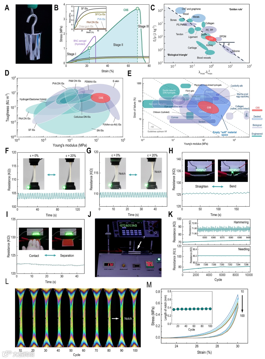 双网络结构使CIIS在机械性能上具有传统IS无法比拟的优势。如图2所示,CIIS的应力-应变曲线表现出典型的类皮肤韧性材料的三阶段行为。CIIS具有典型的纤维增强复合材料韧性断裂特征。即使出现宏观缺陷,试样仍能逐渐承受外部载荷。这种韧性断裂机制可以归因于纤维网络的逐渐断裂、微丝的有限滑移和拉出以及基体的粘性阻力的协同作用。CIIS在刚度(51±15 MPa)、强度(6±1 MPa)、韧性(1.6±0.7 MJ m−3)和拉伸性(40 ~ 80%)之间保持着良好的平衡。其位于“生物三角”区域,进一步证实了其模仿皮肤的力学行为。此外,CIIS能够承受一系列严酷的、动态的、长期的机械刺激,而电响应非常稳定,且没有发生物理损伤。