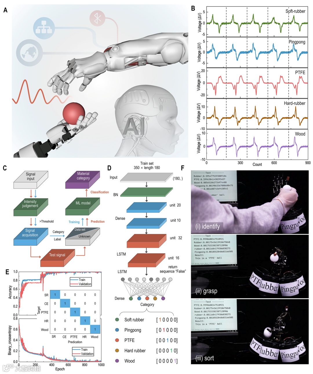基于电子皮肤在识别方面的需求,可将其组装成类皮肤摩擦发电机(SL-TENG),其中可使用CIIS和丙烯酸弹性体分别作为电极和介电材料,将其组装成智能传感识别系统。如图3所示,当SL-TENG接触不同材料时,不同物体产生的输出电压信号的峰值轮廓具有可重现性差异,在某些情况下,这些差异相对较弱,很难被人类区分出来。然而,通过数值优化方法,使用机器学习(ML)模型可以拟合决策结果,并在训练过程中主动发现隐藏在信号中的特征。基于循环神经网络构建ML模型,对软橡胶、乒乓球、聚四氟乙烯、硬橡胶和木材等不同介质物体产生的输出电压信号进行训练和聚类。为了避免同一材料信号强度的差异导致过拟合,在模型开始时采用批归一化和密集层对信号进行归一化,然后对信号进行预处理,提取初步特征。为了提高时间信号分类的可靠性,该模型以长短期记忆网络为核心。最后,模型通过softmax函数归一化后,输出物体属于每个材料类别的概率。在没有过拟合的情况下,信号分类精度收敛于100%,高识别成功率使构建的人形机械手能够系统地模拟人手对这种介电物体的识别和分类。通过物联网技术将SL-TENG集成在机械手的手指上,手指敲击电介质物体五次后,SL-TENG能够准确识别出球的材料类型,并将其送入带有相应标签的篮子中。在600次分类测试中,机械手的成功率高达97.2%,证明了SL-TENG在识别和分类任务中的有效性和准确性。此外,即使部分受损,这些机械手仍可以正常工作。在480次分选试验中,分选成功率仍高达98.1%。