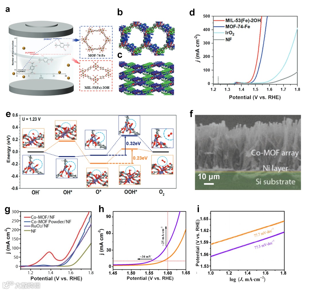 OER是电催化水分解的阳极反应。反应涉及四电子的转移,是动力学滞后过程,比析氢反应更复杂。OER需要更大的过电位来完成,其过电位远高于水的理论分解电压(1.23 V)。因此,构筑高效廉价稳定的OER电催化剂是提高电解水能效的关键。目前贵金属铱和钌的氧化物(IrO2和RuO2等)仍是最高效的基准OER电催化剂。一般有几种策略来提高MOFs材料滞后OER的动力学:一是构建阵列纳米结构或将MOFs制备成二维导电纳米片;二是构建具有不饱和金属配位点的MOFs;三是引入不同的功能化配体,并通过改变金属/金属簇的数量来构建多金属组分的MOFs;四是通过复合纳米颗粒或无机活性材料来调节电子结构,并通过调节界面耦合来实现改性/重构等。