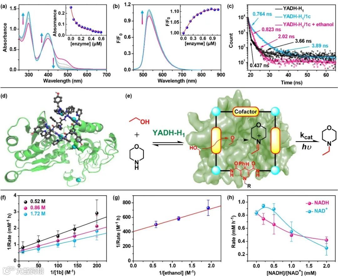 的对接计算;(e)催化反应的机制(f,g)不同底物浓度的双倒数绘图;(h)初始速率随外加NADH或NA