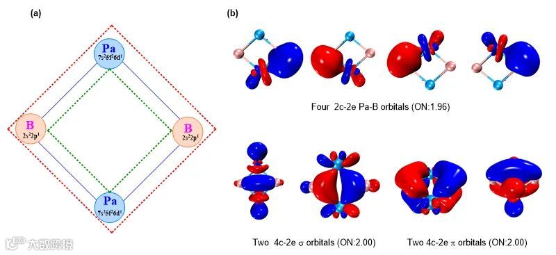 可形成稳定的准四方形平面结构。该结构具有四根完全相同的Pa-B键且键长 (2.200 Å) 远小于两个原子的共价半径之和,展示了多重键本质。更有趣的是,两个Pa原子之间的距离仅为2.879 Å,与理论预测的双重Pa=B键长(2.86 Å)非常接近。为了更好地理解