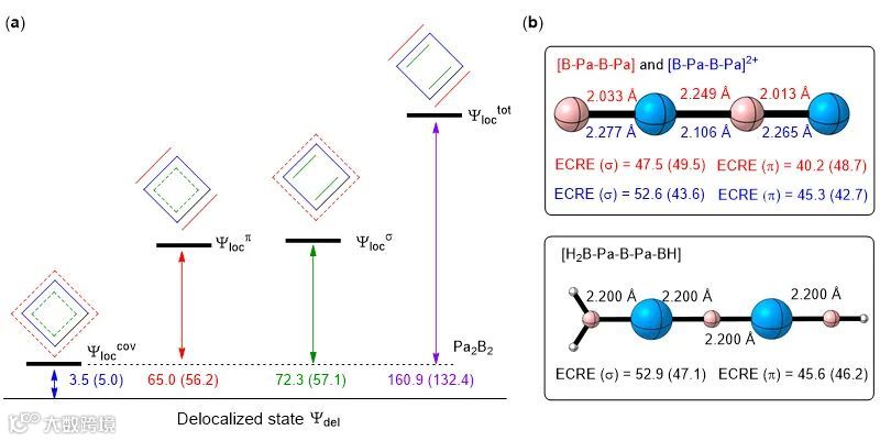 分子的成键模式逐渐清晰,即包含四个定域的Pa-B σ共价键和两个离域的σ键和π键。